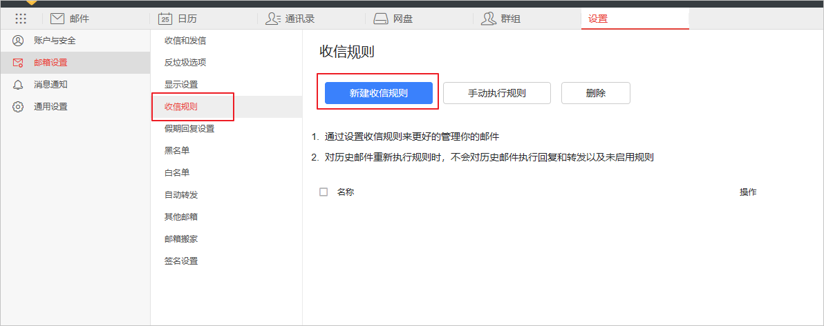 1. 选择收信规则 ,单击新建收信规则。