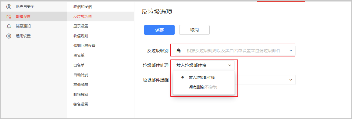 4. 通过反垃圾选项对反垃圾级别进行调整,并更改垃圾邮件处理方式。