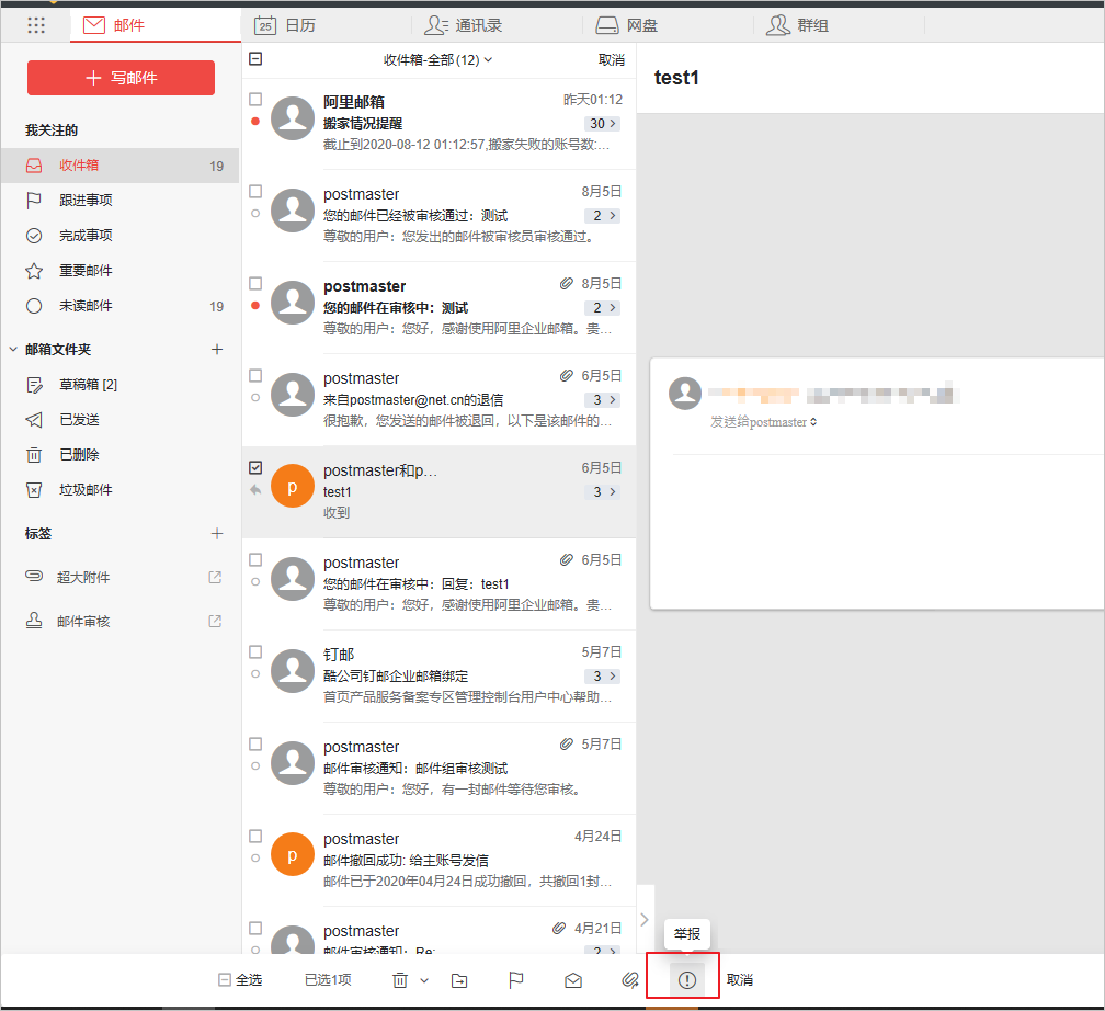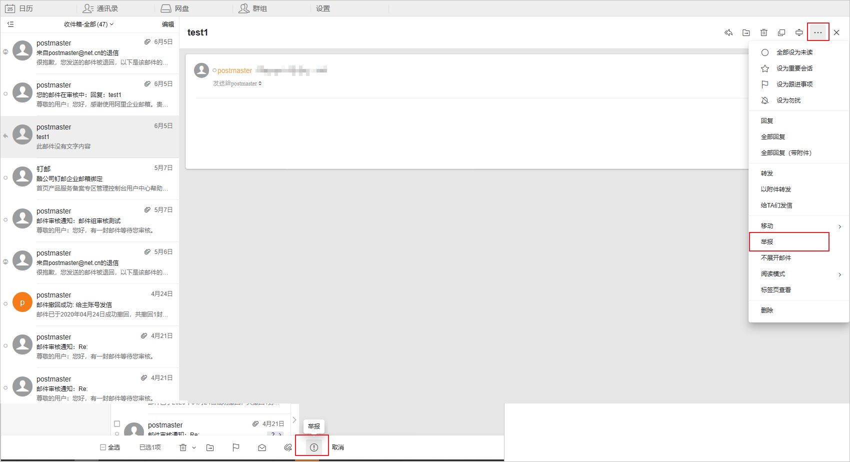 • 在邮件列表中勾选需要拒绝的邮件,单击举报按钮。