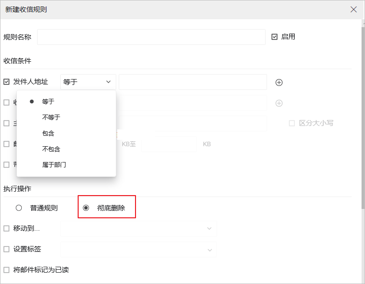 2. 编辑邮件规则,设置发件人地址等于邮箱地址,或包含邮箱用户名或者邮箱域名,选择符合条件执行彻底删除,后续来信将自动执行此规则。