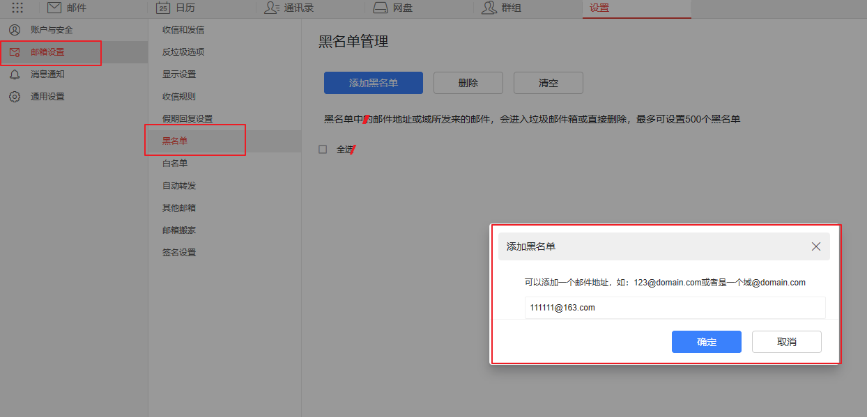 通过邮箱设置的黑名单功能对其后续来信进行设置