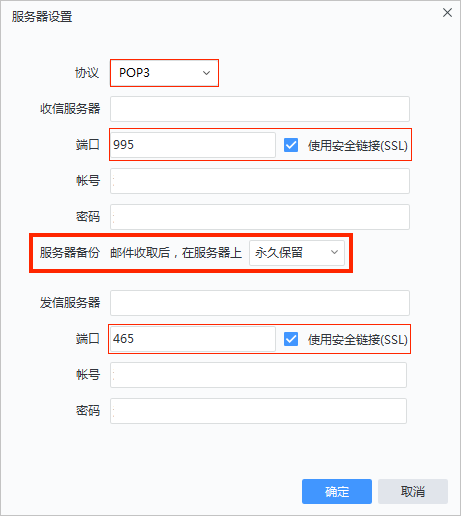 注意:在设置POP协议时会有在服务器保留周期的选项,建议选择永久保留,否则邮件会在一段时间后从服务器中删除。