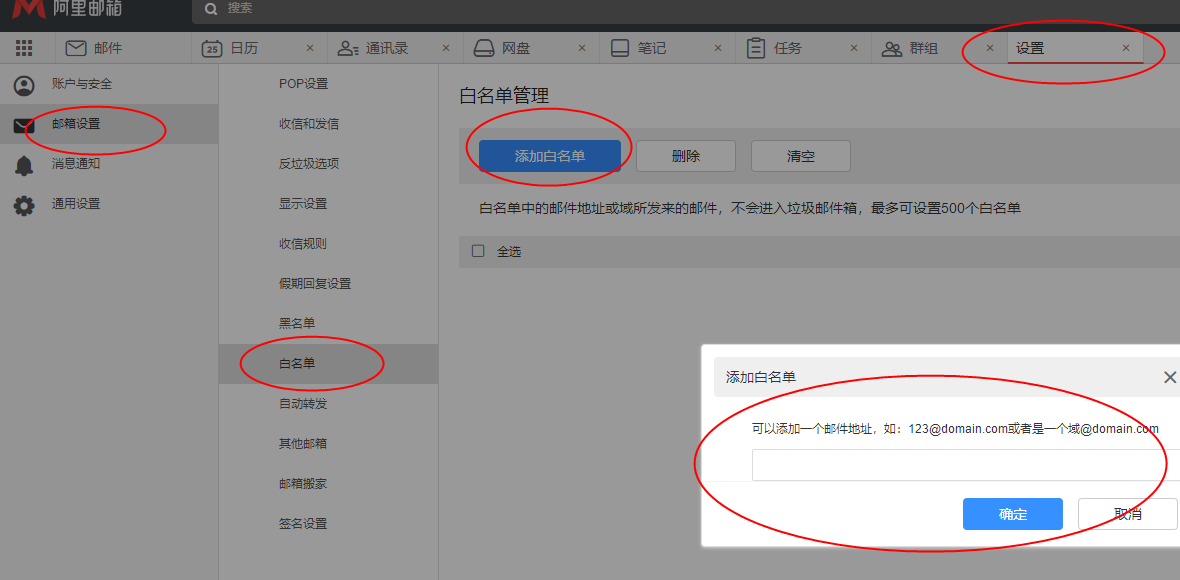 5)将对方的邮件地址加入白名单,设置方法是:点击“邮箱设置”标签,然后点击“反垃圾”标题,在“反垃圾”内容页面中点击“白名单”。在“白名单管理” 下方编辑框中输入要加入白名单的邮箱地址,点击“添加白名单”按钮,该地址显示在列表框中,设置成功;