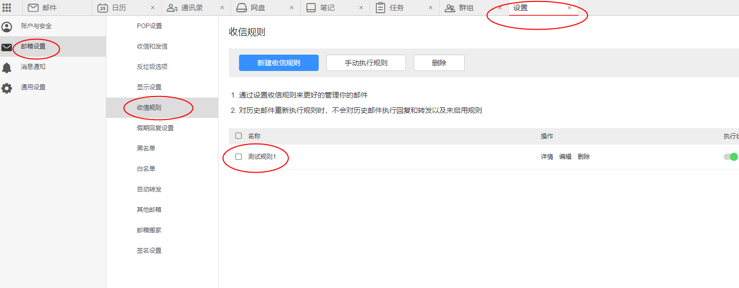 2)检查收信规则的过滤设置。在邮箱页面右上角点击“邮箱设置”,打开设置页面,点击“收信规则”,检查过滤规则的条件是否设置不当,如选择满足条件的邮件执行“直接删除”或“转发后删除”操作,或者是转移到其它的"已删除"邮件夹.