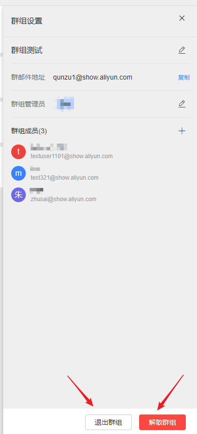 2)群组管理员可以解散群组,点击解散按钮,二次确认后该群组被解散。解散后的群组,之前所收取到的邮件,会保存在收件箱中。群任务仅可以查看到与该成员相关的任务。群文件会进行删除操作无法查看。