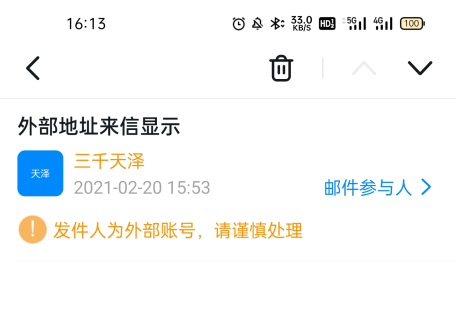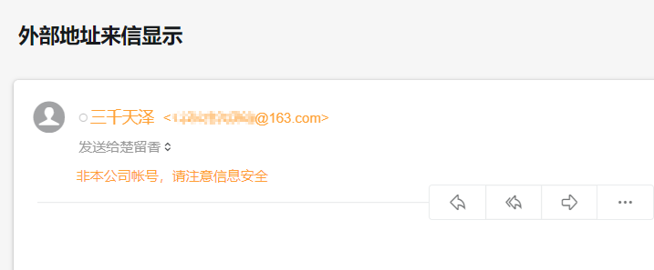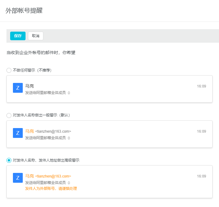 外部账号提醒是企业在收信场景中针对发件人地址显示提醒程度设置的功能。管理员可在域管对外部地址显示提醒做自定义设置,分别为不做任何警示 、对发件人名称做出一般警示 、对发件人名称、发件人地址做出高级警示 。