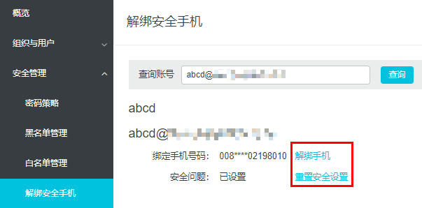 如果邮箱原使用者离职或做业务交接,本邮箱需要给下一位同事使用,或原绑定的安全手机因某些原因不可用,之前绑定的安全手机可由管理员解绑,包括设置的安全问题也可以重置。