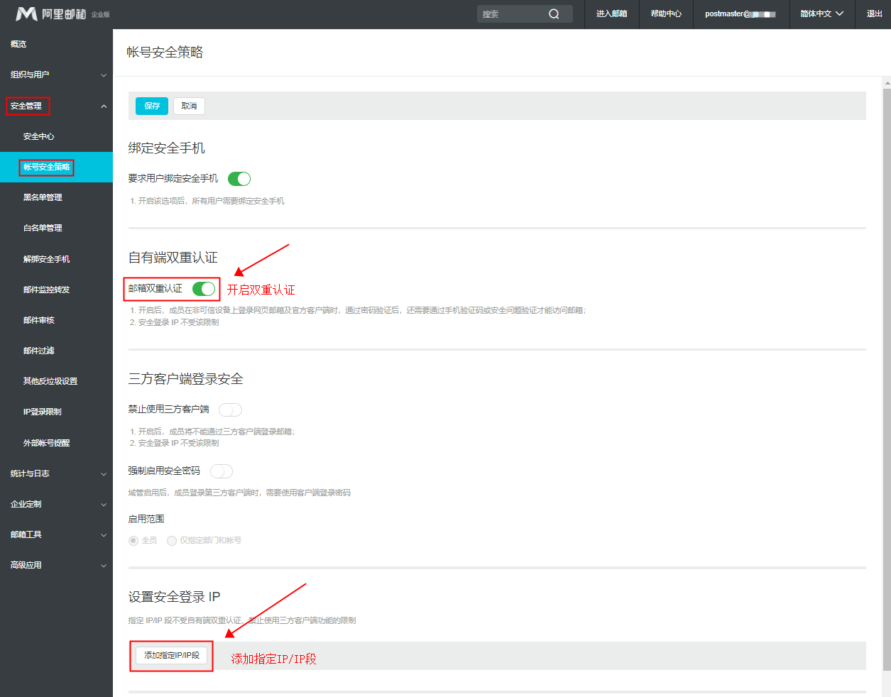 开启后,成员在非可信设备上登录网页邮箱及官方客户端时,通过密码验证后,还需要通过手机验证码或安全问题验证才能访问邮箱;