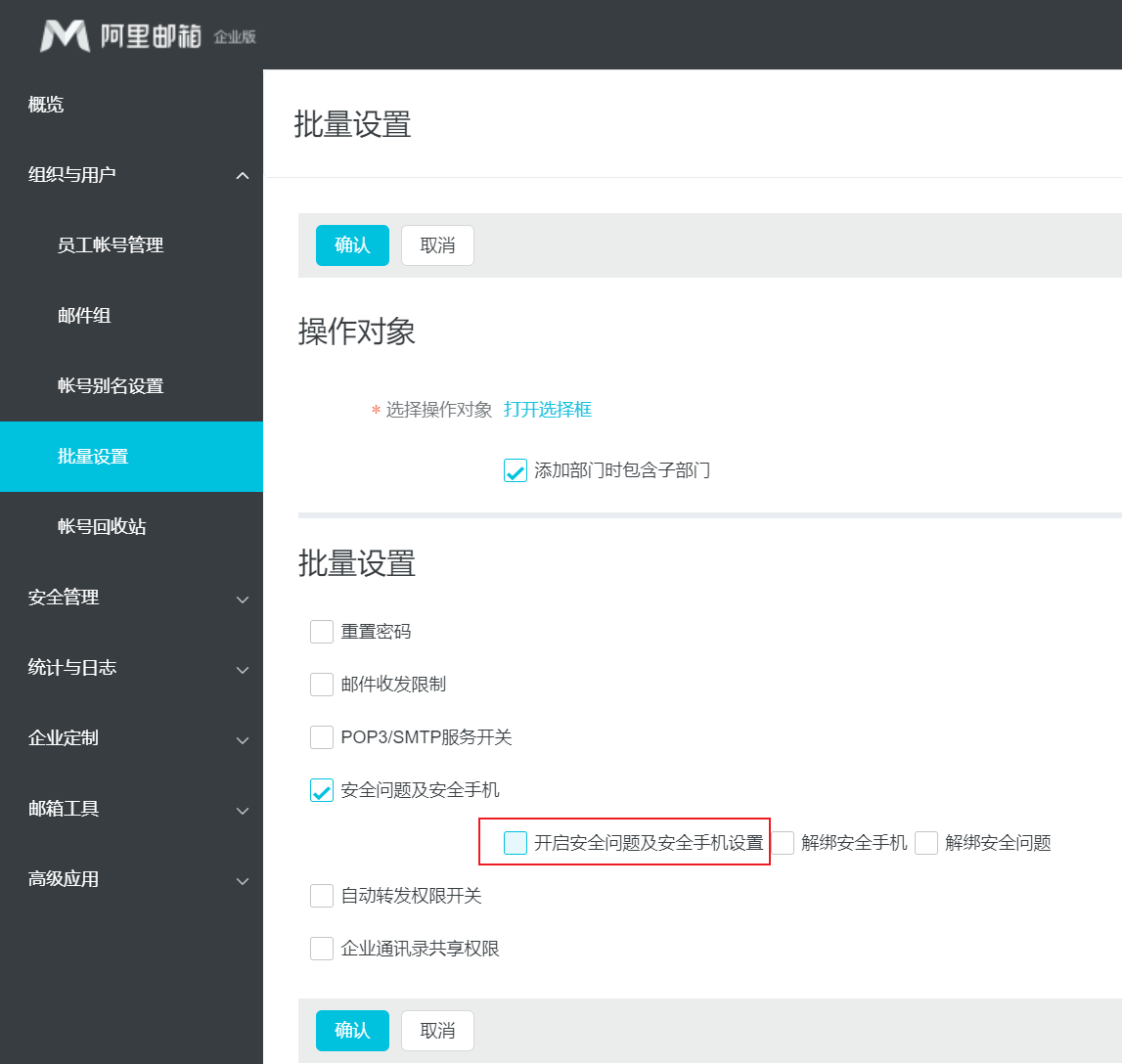 2、双重认证总开关开启后,双重认证可以针对指定账号开启和关闭,点击 组织与用户 — 批量设置 — 添加需要操作的对象之后,执行批量设置 。