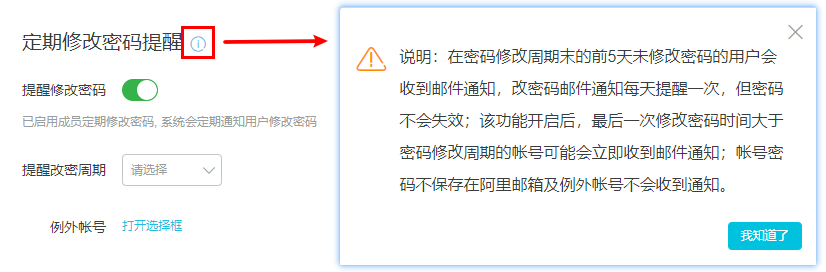 开启该功能后,系统会按照改密周期定时发送提醒。从改密周期到期的前5天开始,未修改密码的用户会收到改密码邮件通知,每天提醒一次。