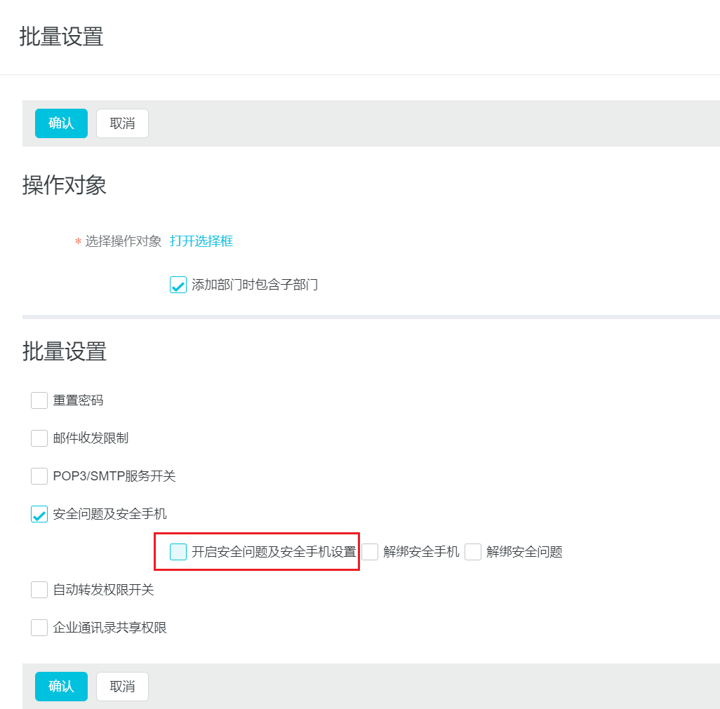 4、除了上述账号编辑页面可针对账号进行安全问题及安全手机开关,也可通过 组织与用户 中 批量设置 进行批量操作。