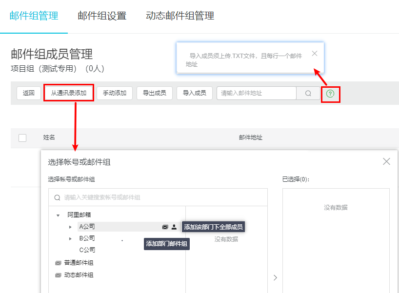 此处为 静态邮件组,邮件组中包含的成员需要手动添加。