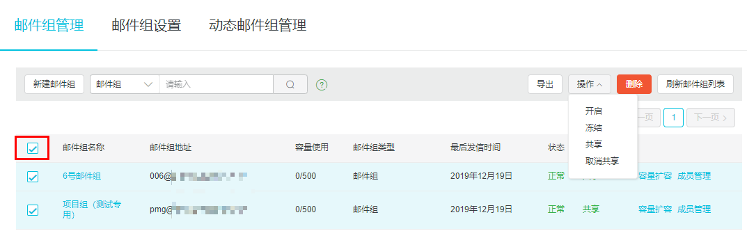 2、勾选后,可以对邮件组进行批量 导出/冻结或开启/在通讯录里共享或不共享/删除 等操作。