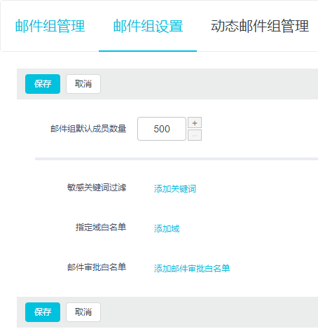 邮件组权限 | 设置允许往此邮件组发送邮件的范围,其中: 只允许同域账号往邮件组发信:表示只允许同域,即同一邮箱后缀的账号向此邮件组发送邮件。默认为此项设置。 只允许邮件组成员往邮件组发信:表示只允许此动态邮件组中的成员向此邮件组发送邮件。 允许所有账号(域内外均可)往邮件组发信:对往此邮件组发送邮件的邮箱账号不做任何限制。 只允许白名单账号往邮件组发信:表示只有白名单中的邮箱账号才具备往此动态邮件组发送邮件的权限。 |