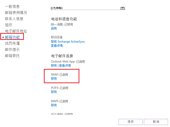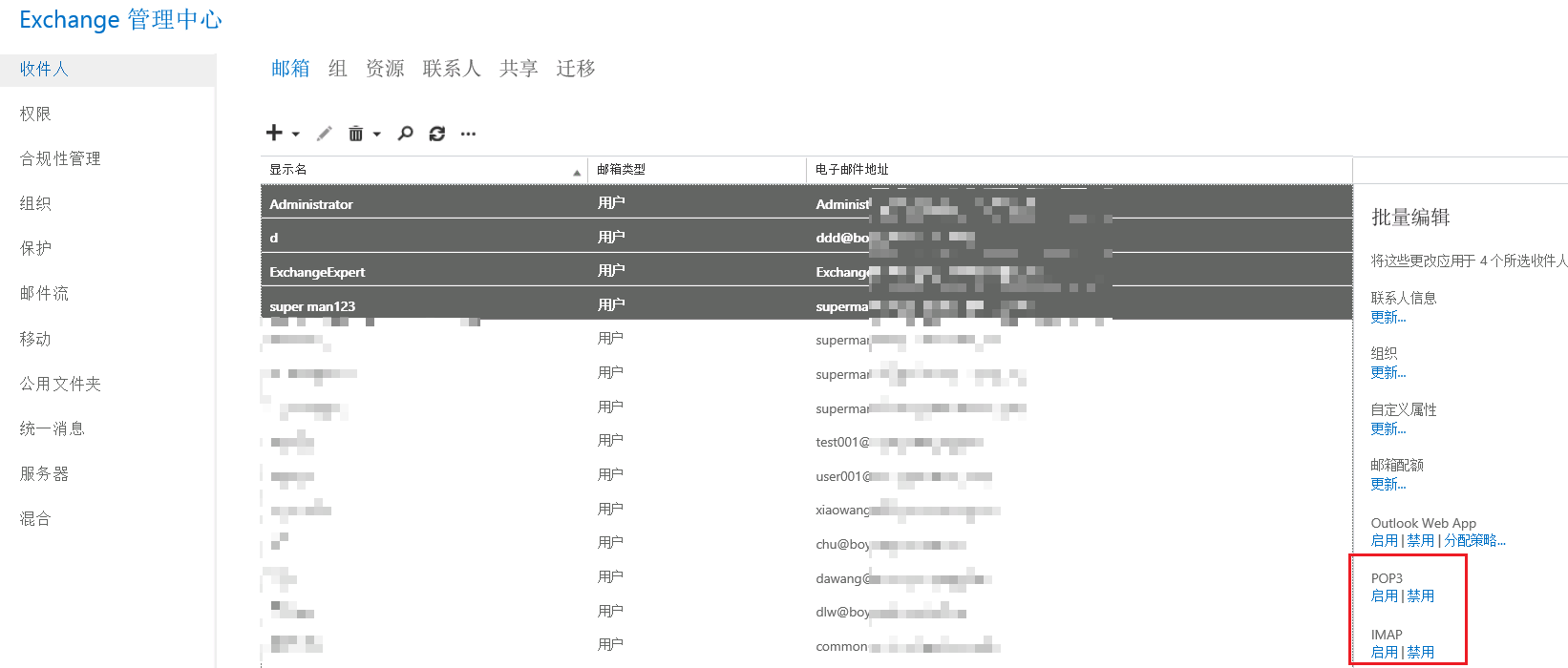 [注:exchange各版本功能位置会存在差异,请以各版本实际情况为准。]1、请确保 imap/pop 服务已开启。Exchange2013管理后台 —> 收件人 —> 选中账号后批量开启imap/pop3。