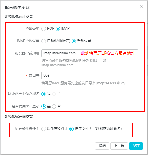 建议采用 IMAP 协议类型,能够迁移原邮箱内所有邮件夹及邮件, POP 只迁移收件箱里的邮件。