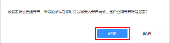 员工使用阿里邮箱管理员在创建阿里邮箱账号时,设置的初始账号密码,进入阿里邮箱webmail 后,系统会提示域搬家已开启,点击确认进入搬家设置。
