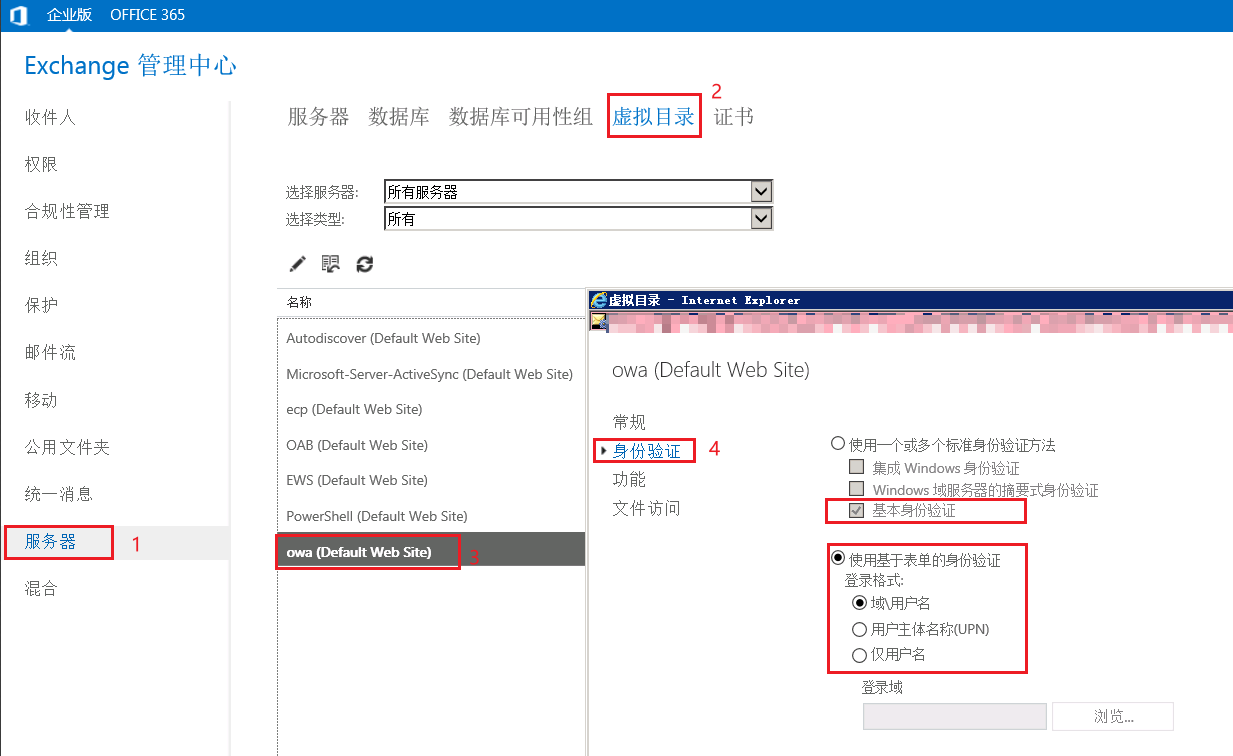 Exchange管理后台 —> 服务器 —> 打开MAIL(邮箱客户端访问)。