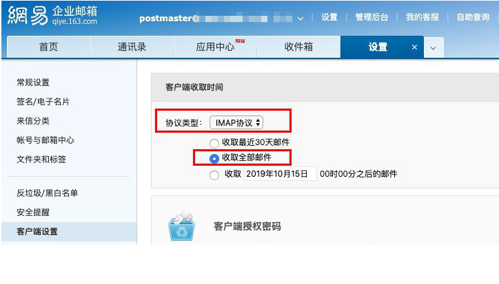 1、请确保已经将“收取选项”设置为“收取全部的邮件”,否则将只能搬最近 30 天的邮件。设置—> 客户端设置—> 协议类型:“IMAP协议”、“收取全部的邮件”。
