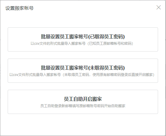 如果管理员未获取原邮件系统中的员工密码,可以上传CSV文件,使用原有邮箱密码登陆后直接开启搬家。