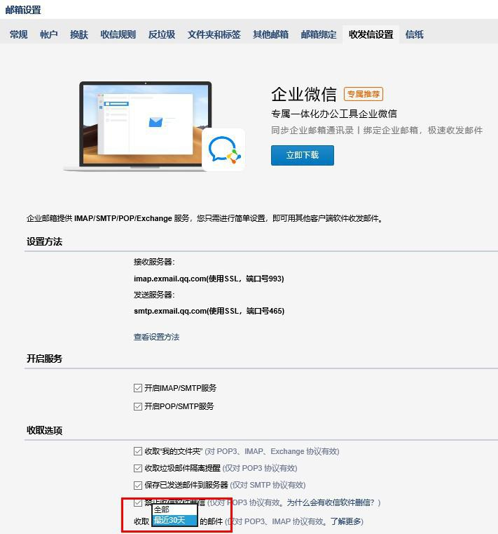 2、请确保已经将“收取选项”设置为“收取全部的邮件”,否则将只能搬最近 30 天的邮件。 邮箱设置—>收发信设置—>收取选项,然后设置成“收取全部的邮件。