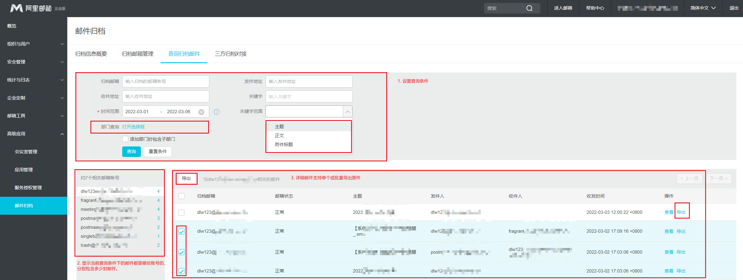 查看归档邮件:进入域管理界面,点击“高级应用”-“邮件归档”-“查询邮件归档”,输入需要查询的条件点击查看即可看到哪些账号有此相关的邮件。