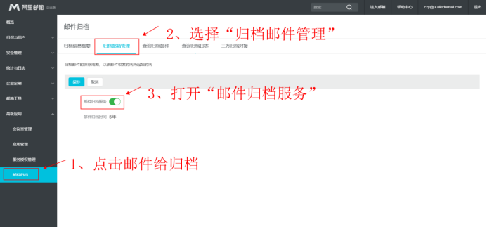 邮件归档服务默认关闭,需登录归档管理员账户,进去域管理-“邮件归档”-选择“归档邮件管理”-打开“邮件归档服务”。