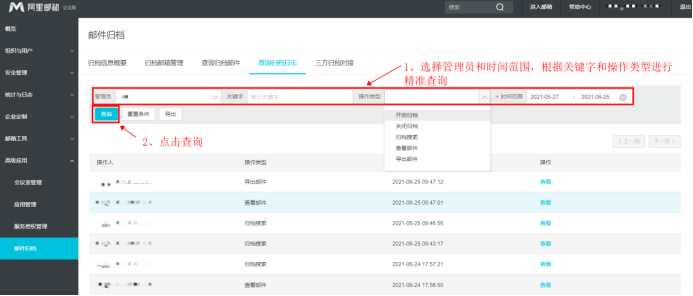 查看归档邮件:进入域管理界面,点击“统计与日志”--“查询归档日志”,选择管理员和时间范围,根据关键字和操作类型进行精准查询。