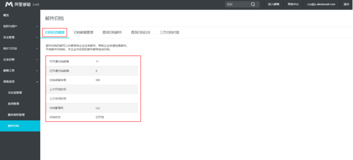 已开通归档邮箱:企业已经开通邮件归档服务的邮箱数。
