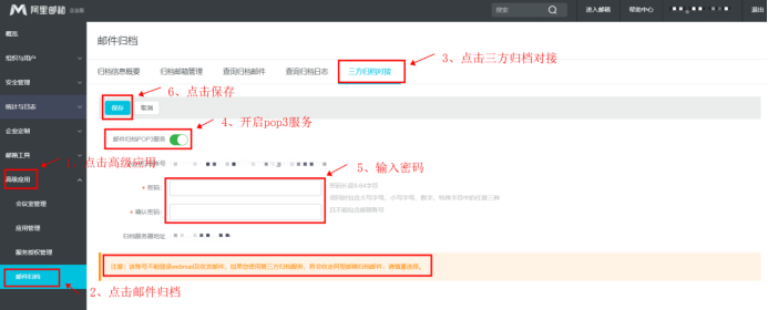 设置POP3密码:进入域管理界面,点击“高级应用”-“邮件归档”-“三方归档对接”-开启“邮件归档POP3服务”-输入密码吗-点击“保存”。