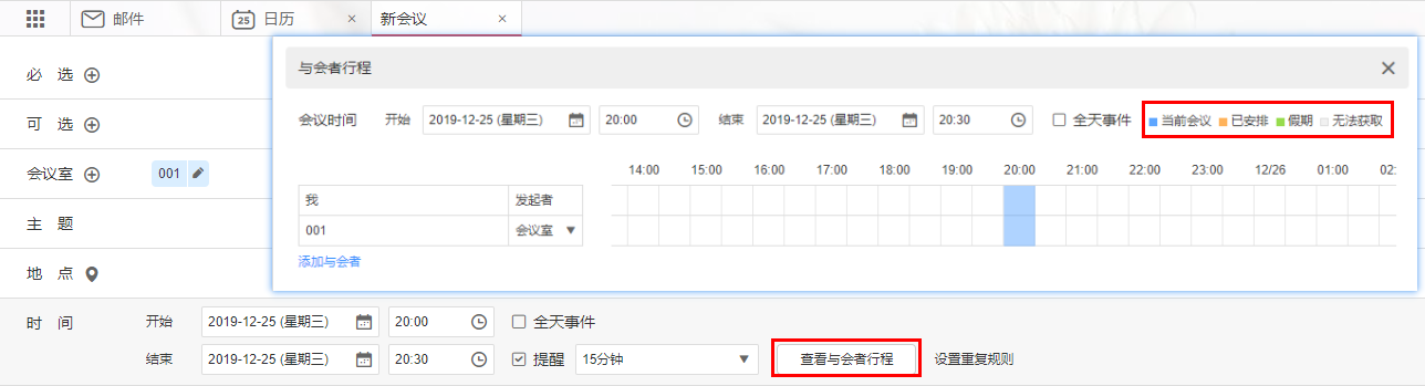 2、用户在webmail发起会议,添加会议室,点击 查看与会者行程 ,即可查看会议室预定情况。