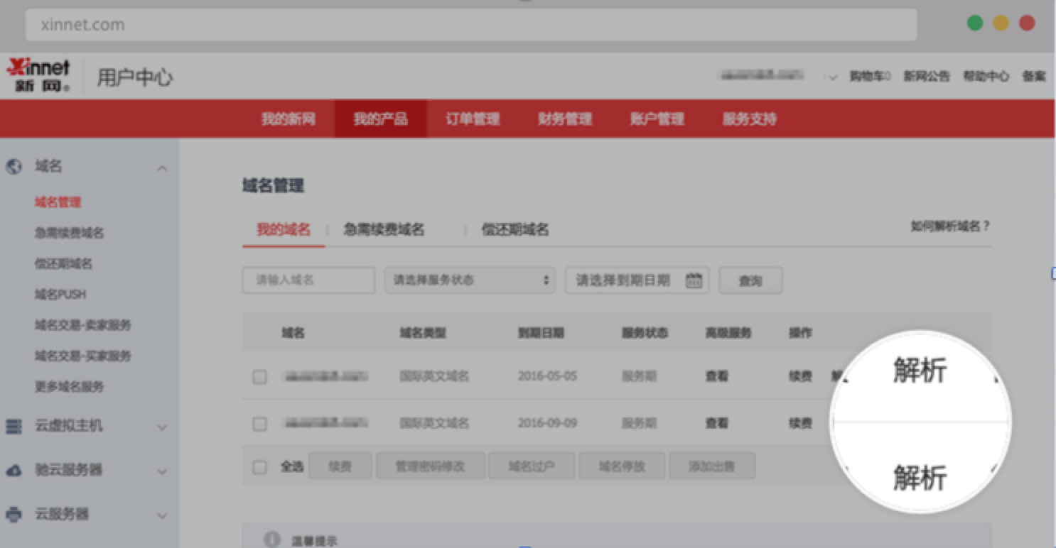 ② 进入域名管理页,点击所要添加记录的域名右侧的【解析】