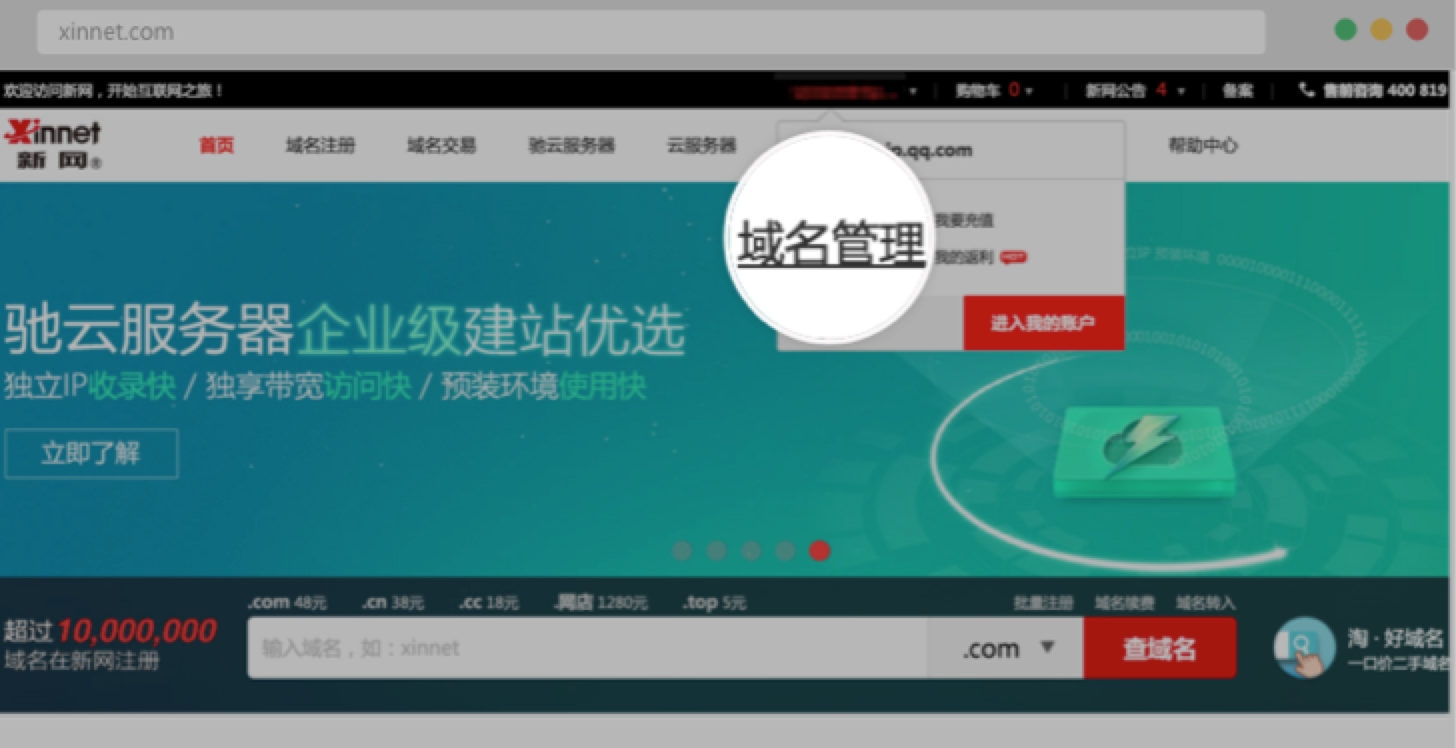 ① 登录新网,进入首页鼠标移至上方帐号名处,点击下拉框内的【域名管理】