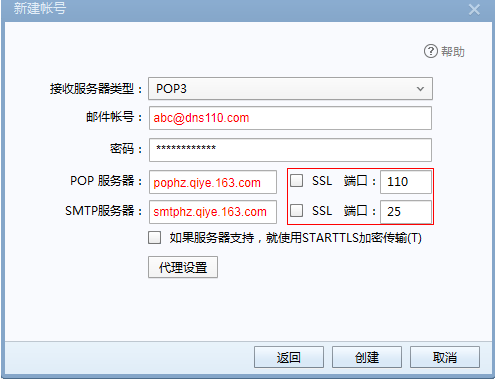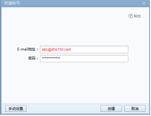 填入完整的邮箱地址:abc@dns110.com、密码,并单击左下角手动设置按钮。