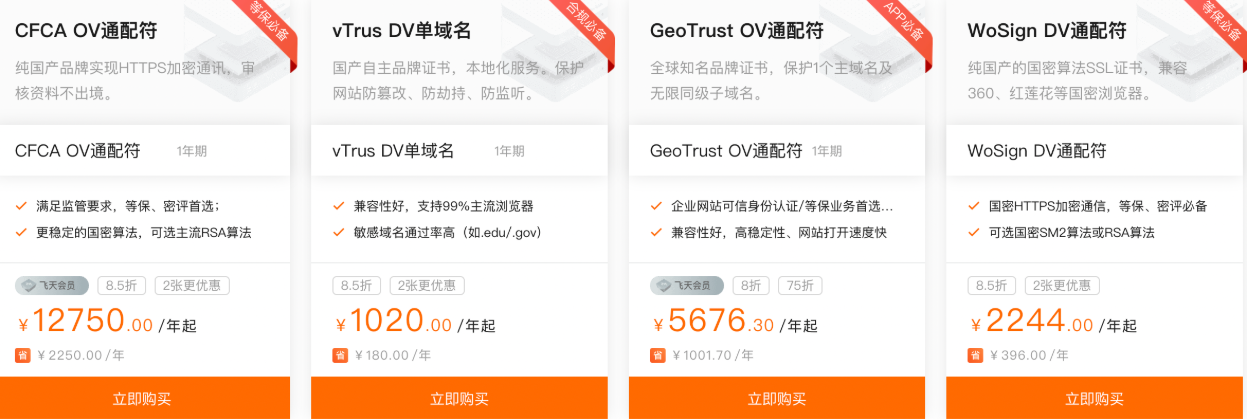域名证书购买请访问阿里云官网:www.aliyun.com,搜索域名证书进行购买,邮箱应用建议购买“GeoTrust DV通配符”类型证书即可。