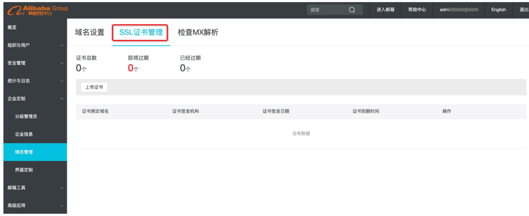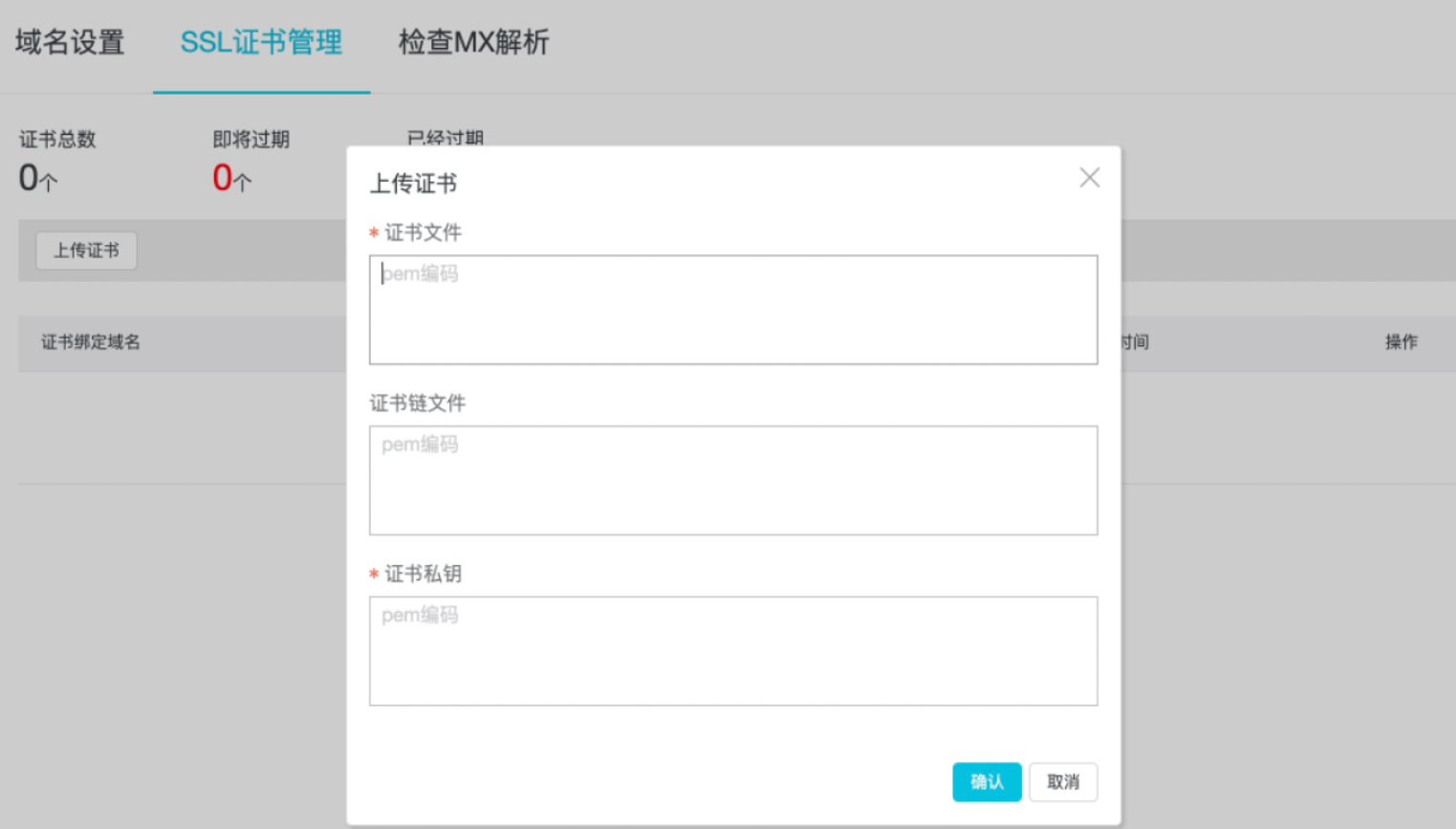 登入邮箱域管平台-企业定制-域名管理-SSL证书管理-上传证书
