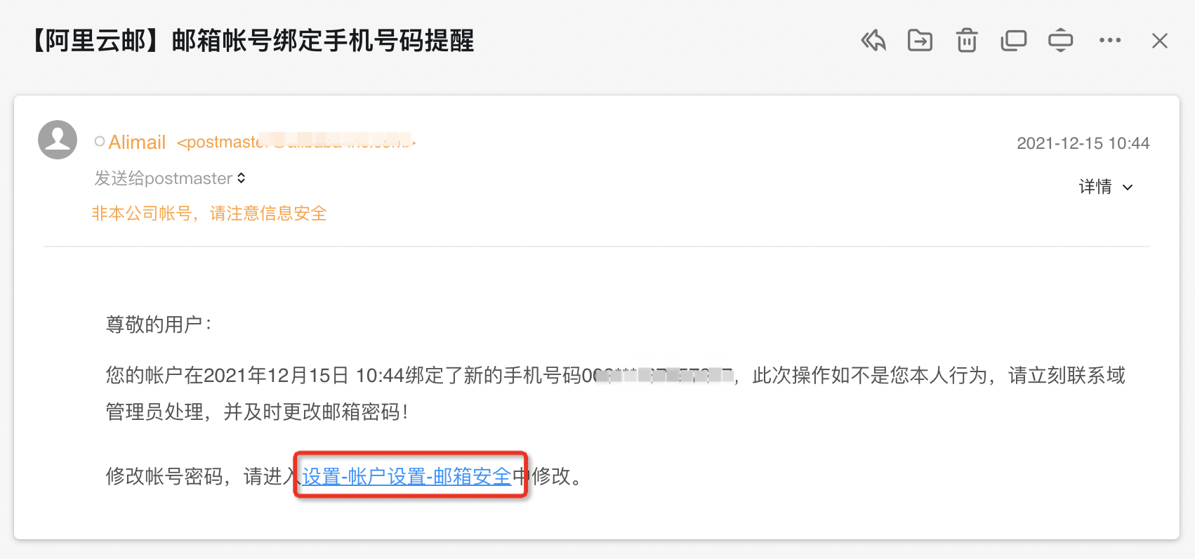 功能邮件链接是指在审核邮件、通知邮件(如下图)等功能邮件中,用于跳转到邮箱其他页面的链接,默认为qiye.aliyun.com