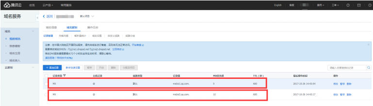 9.开始设置解析记录,在腾讯云-域名管理-云解析下,添加两条解析记录,如下图;