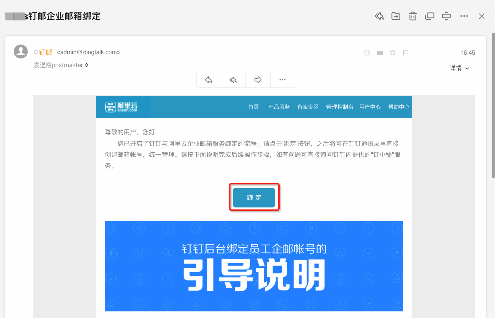 在postmaster邮箱的收件箱里找到该邮件并点击邮件中的绑定按钮。