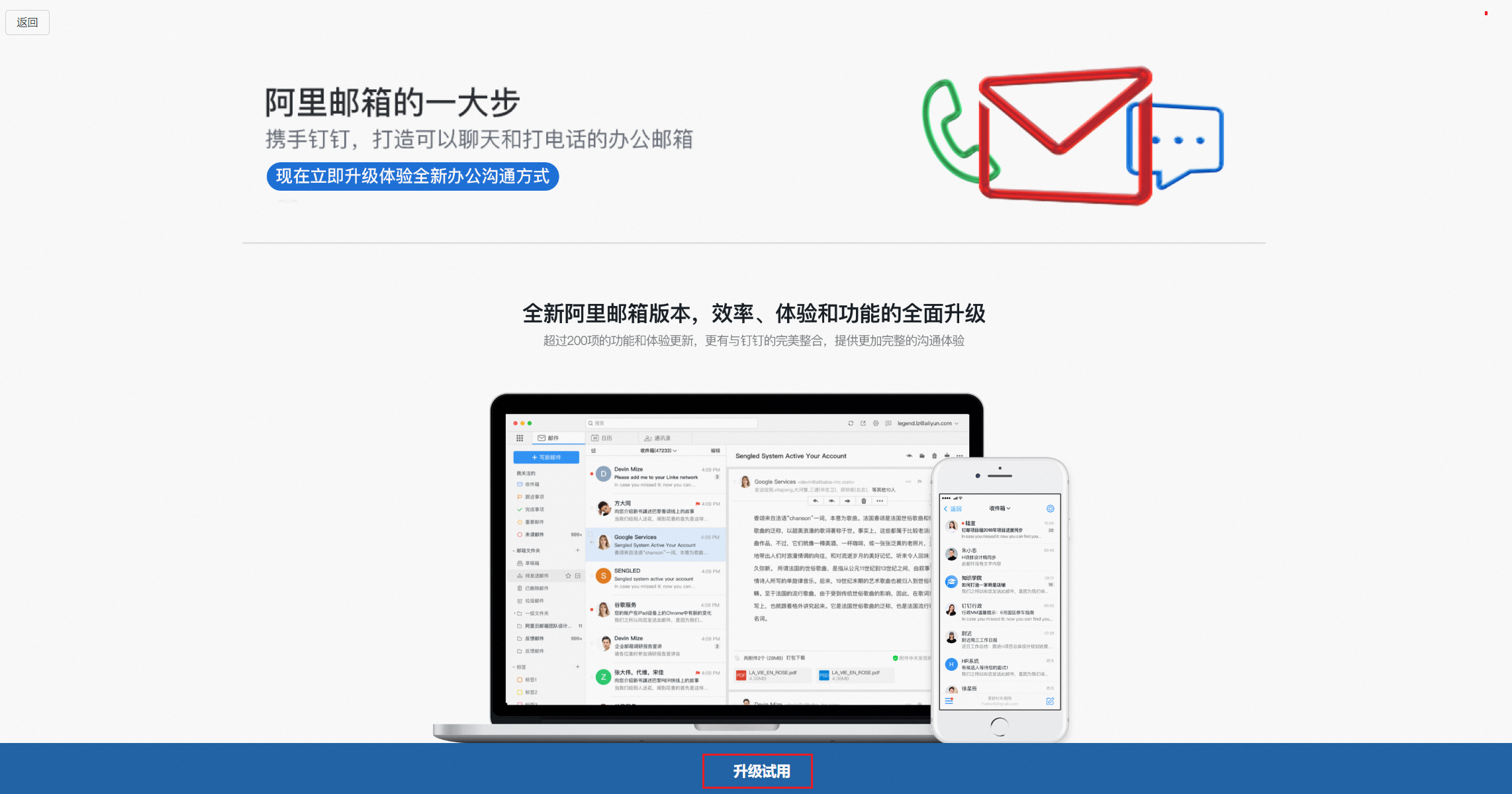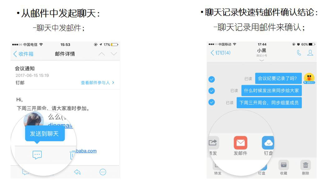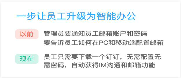钉钉(DingTalk.com)是阿里巴巴集团为高校、企业团队打造的聚焦于工作/商务的即时通讯工具,旨在提升内外沟通协同的效率。阿里不仅仅提供邮箱,还提供一整套的企业协同办公解决方案。针对目前很多企业存在的办公系统间各成孤岛,用户需要安装各种应用,入口繁多,操作复杂。阿里基于企业通讯录以钉钉作为企业协同的统一入口。“钉钉+邮箱”提供的不仅是沟通社交,更是基于交流去打造高效协同的新的工作方式。钉邮作为邮件客户端,和阿里邮箱深度结合,使邮件操作体验和钉钉特色功能完美结合,在钉钉上通过钉邮使用阿里邮箱的企业邮箱服务,体验全新的邮件收发体验,每封邮件使命必达,让邮件像聊天一样简单。