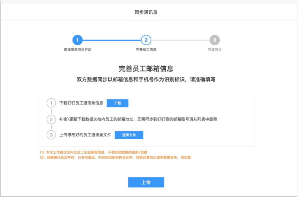 方式2:邮箱管理后台升级钉邮后到了同步步骤时,上传同步的Excel,Excel中填写企业邮箱字段