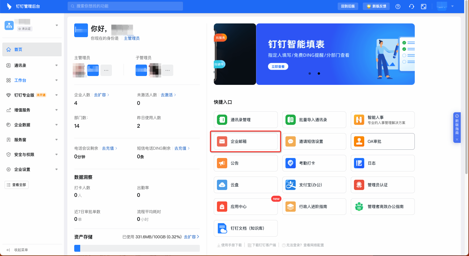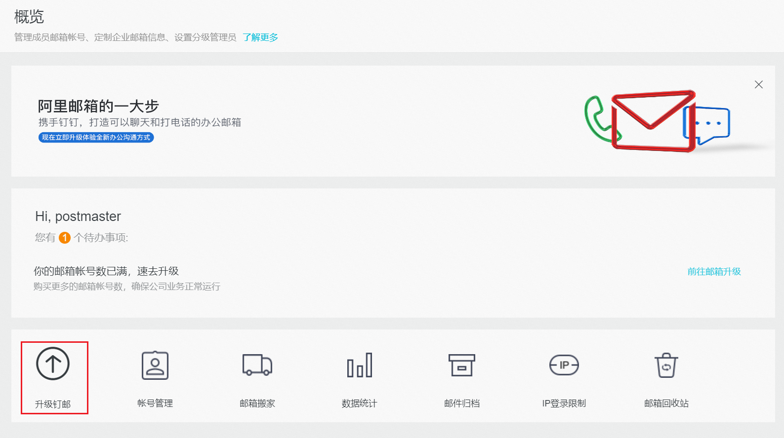 邮箱管理后台概览页点击升级钉邮;