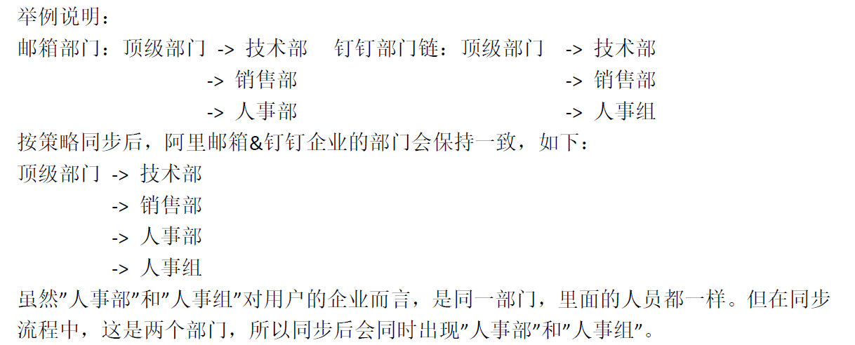 目的 解决阿里邮箱&钉钉企业用户在组织架构管理上,阿里邮箱&钉钉企业组织架构不一致的痛点。 实现只需在钉钉OA 后台上维护钉钉企业的组织架构(或者通过三方OA 保持跟钉钉OA 的同步),即可让阿里邮箱的组织架构保持同钉钉一致的场景。 同步策略须知 同步过程分为两步: 钉钉&邮箱部门同步 : 1)除顶级部门外,同层级同名字的部门,认为是需要建立关联的部门; 2)通过同步Excel触发同步时,钉钉和邮箱侧的部门相互补齐,如果两侧出现多出来其下没有账号的不需要的部门,请手动删除。同步Excel上传同步完成后,后续同步以钉钉侧为准,即钉钉侧增删改部门会同步至邮箱侧,邮箱侧不会同步至钉钉侧 (不论之前同步选的基准是哪一侧)。 3)钉钉侧删除部门,如果邮箱侧对应部门下有账号,则邮箱部门不会同步删除。 钉钉&邮箱账号同步 : 1)可以选择以钉钉为基准、以邮箱为基准。基准侧的员工所在部门不变化。非基准侧的员工所在部门会变化,保持同基准侧一致。 2)钉钉侧删除账号,邮箱账号默认冻结。 同步过程不会创建企业邮箱帐号,所以同步步骤的同步Excel中务必填写已存在的企业邮箱帐号,否则校验不通过无法完成同步。 同步步骤Excel中修改员工所在部门,不会生效;修改工号、姓名等,生效; 无需同步的钉钉账号和邮箱账号请勿建立分配关系,也请勿通过同步Excel填写企业邮箱地址并进行上传。 同步效果 员工的企业邮箱帐号信息自动保持同钉钉员工信息一致,包括姓名、工号、职位、手机、部门; 员工入职,在钉钉OA 后台上即可分配邮箱帐号,阿里邮箱会同步创建帐号,保持同钉钉侧一致的部门架构; 员工离职,在钉钉OA 后台上操作员工离职,可选择冻结或删除邮箱帐号,并在钉邮上踢出企业邮箱帐号的登录; 员工换部门,在钉钉OA 后台上操作员工换部门,阿里邮箱会同步移动员工企业邮箱帐号所在的部门,保持同钉钉侧一致的部门架构。