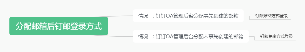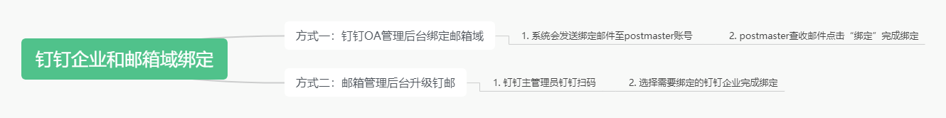 目的 解决员工入职,需要在邮箱、钉钉等多套系统后台操作账号加入的痛点; 解决员工离职,在钉钉等OA上操作员工离职,邮箱仍被员工带走使用的问题。 绑定策略须知 绑定分两步(本文介绍不包括绑定三方邮箱): 钉钉企业&邮箱域建立绑定关系: 1)邮箱域已解析至阿里:通过邮箱管理后台升级钉邮或登录钉钉OA管理后台绑定邮箱域。 2)邮箱域未解析至阿里:通过邮箱管理后台升级钉邮建立绑定关系。 钉钉账号&邮箱账号建立绑定关系 : 1)邮箱侧已事先创建邮箱账号:钉钉OA管理后台给钉钉号分配企业邮箱,即钉钉OA管理后台给钉钉账号信息里填写补全企业邮箱字段完成绑定。 2)邮箱侧未事先创建邮箱账号:钉钉OA管理后台给钉钉号分配企业邮箱,即钉钉OA管理后台给钉钉账号信息里填写补全企业邮箱字段完成绑定,同时邮箱侧会被同步新建对应的邮箱账号。 同步效果 员工可以在手机钉邮上免密码登录自己的企业邮箱帐号(邮箱未事先创建由钉钉OA分配新建的场景); 员工入职,在钉钉OA 后台上即可分配邮箱帐号,阿里邮箱会同步创建帐号,不过账号在邮箱根目录下; 员工离职,在钉钉OA 后台上操作员工离职,邮箱默认冻结,并在钉邮上踢出企业邮箱帐号的登录;