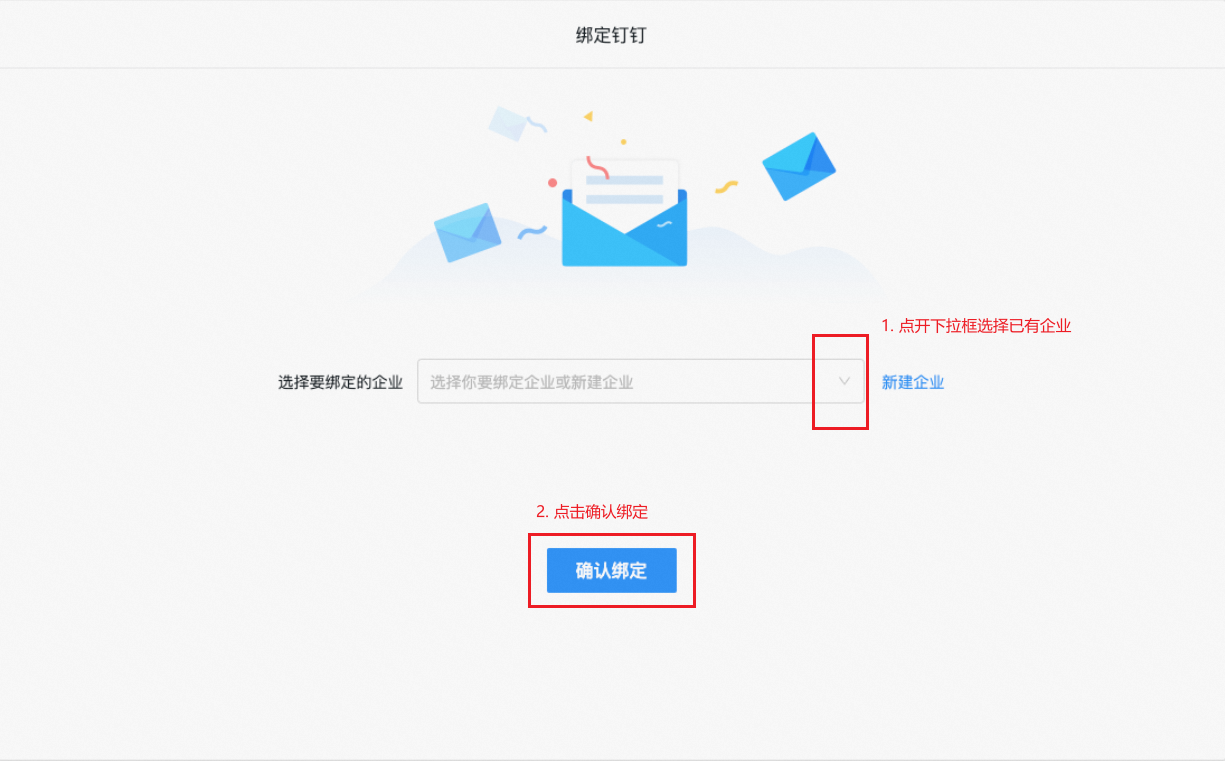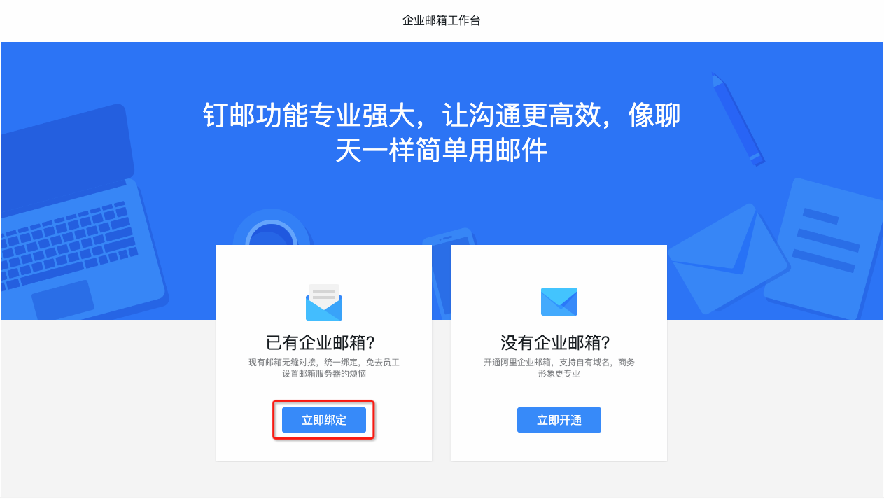 在钉邮控制台选择已有企业邮箱,点击立即绑定。