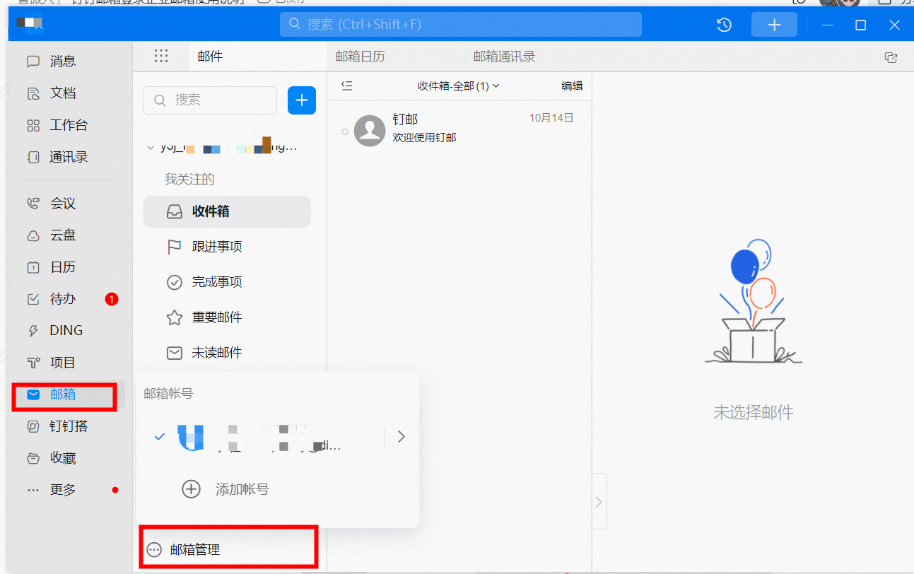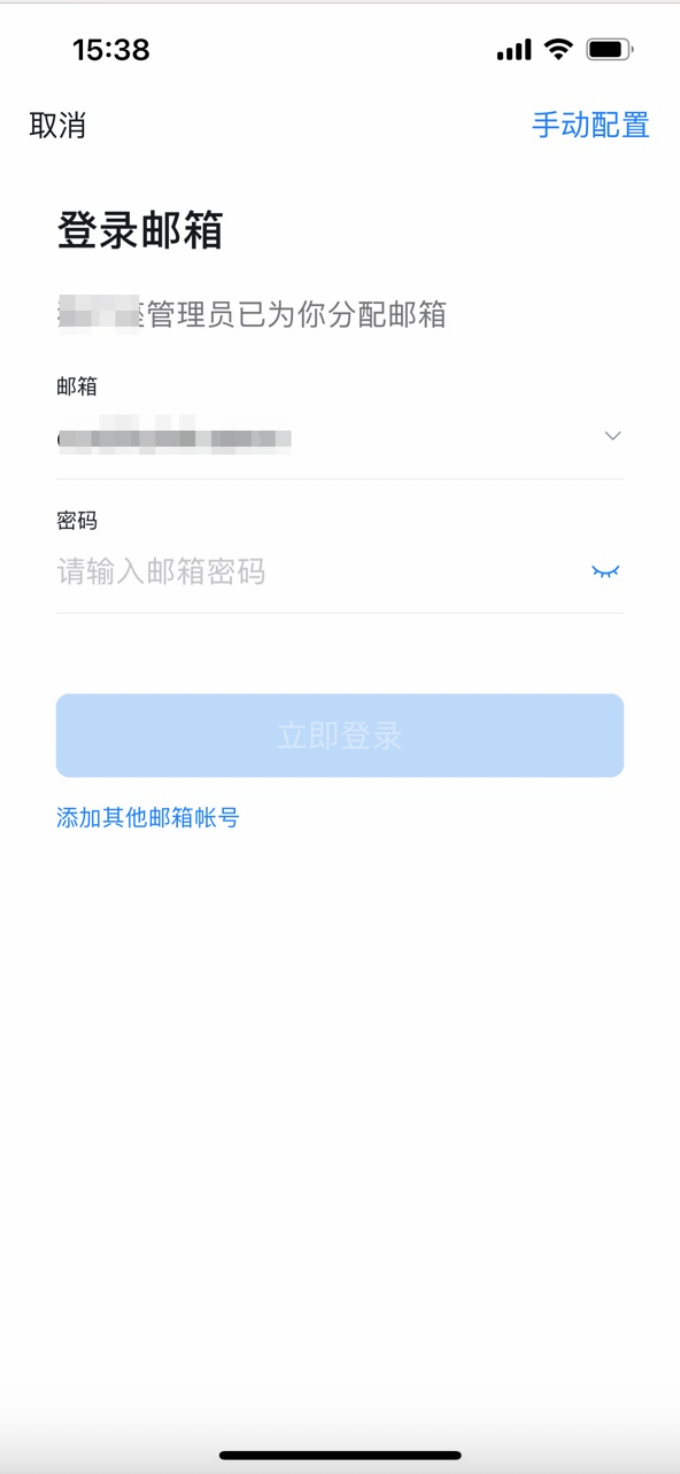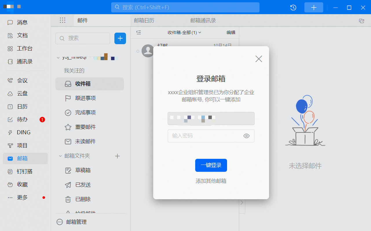 打开钉钉中的邮箱应用。默认打开的是dingtalk邮箱,点击邮箱管理—>点击添加账号—>系统会默认选择后台分配的企业邮箱账号,直接输入密码进行登录。