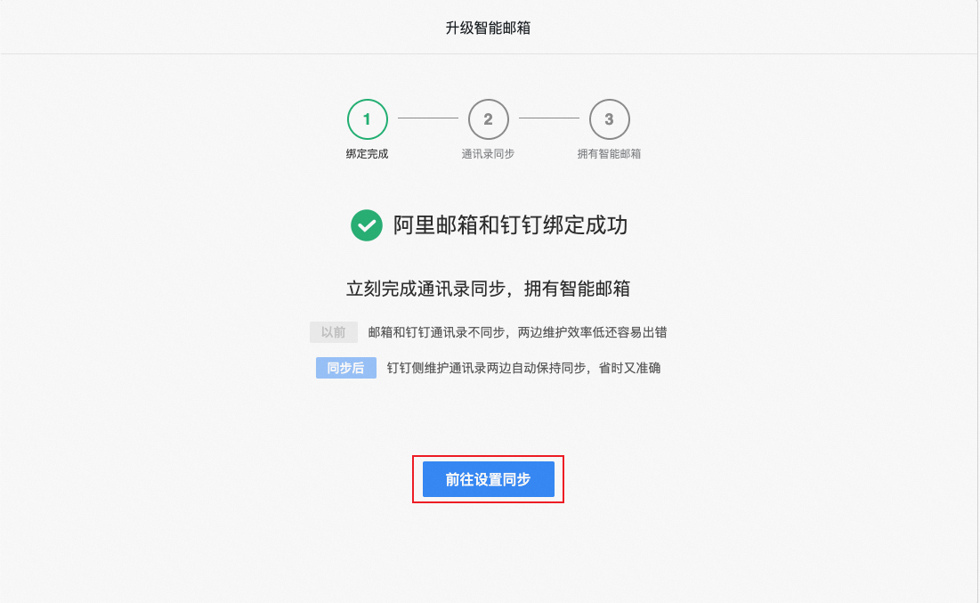 邮箱管理后台钉邮升级的同步步骤中点击前往设置同步;