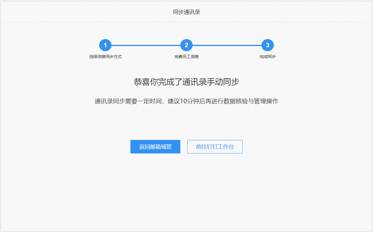 注意通过此方式绑定,往后会紧接着一步用来实现钉钉企业架构和企业邮箱架构的同步。如确认无需做架构同步,可以直接关闭截止目前的操作页面,回到钉钉OA管理后台,在首页快捷入口中找到企业邮箱进入,查看绑定的结果。 如下是接下来的同步页面,如需同步具体请见下方同步操作步骤;