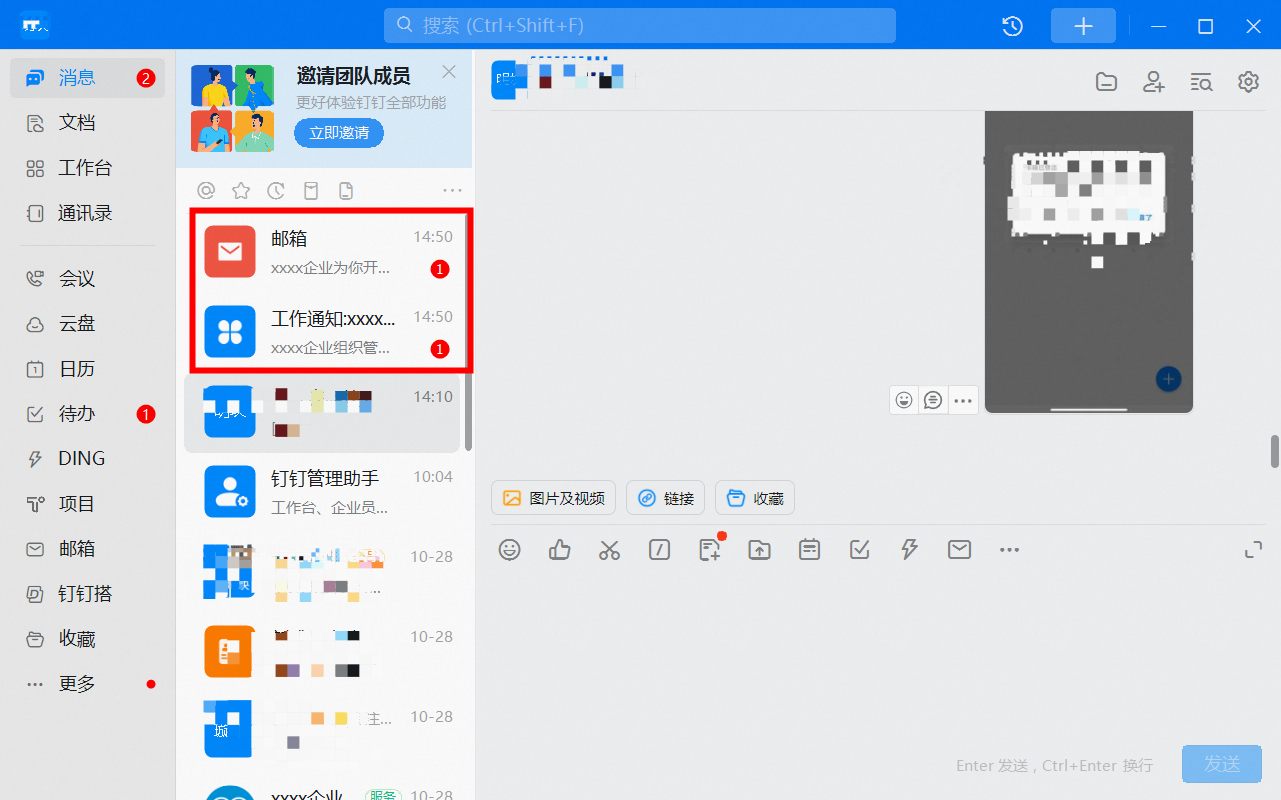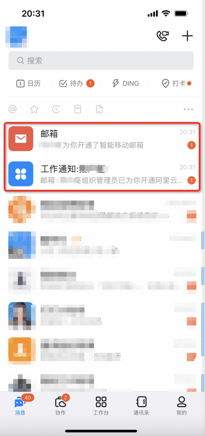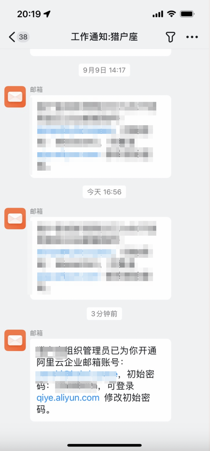 钉钉管理员后台创建企业邮箱后,账号密码等信息将会以钉钉工作通知和短信的方式下发给用户,钉钉中的邮箱也能同时收到消息。