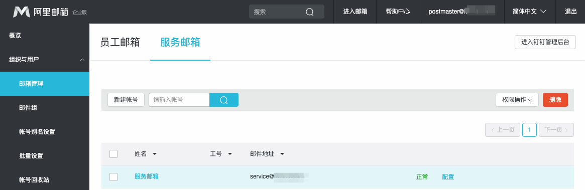 服务邮箱:一般适用于只有邮箱帐号但是没有钉钉帐号的用户如公共帐号,所以此处服务邮箱是专门用于创建邮箱侧独立使用的帐号。
